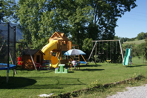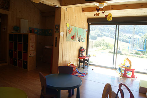 Une grande baie vitrée donnant sur le jardin, avec aire de jeux extérieur, balançoires et toboggans pour petits et grands, jeux à bascules,vélos,trottinettes, porteurs...et d'autres à venir!